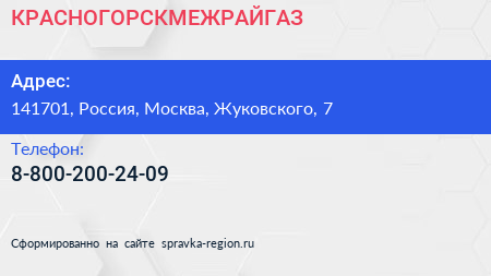 КРАСНОГОРСКМЕЖРАЙГАЗ по адресу 141701, Россия, Москва, Жуковского, 7 в дальнейшем Организация, размещена в следующих категориях: