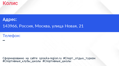 Колис по адресу 143966, Россия, Москва, улица Новая, 21 в дальнейшем Организация, размещена в следующих категориях: