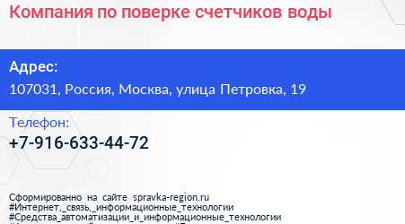 Компания по поверке счетчиков воды по адресу 107031, Россия, Москва, улица Петровка, 19 в дальнейшем Организация, размещена в следующих категориях: