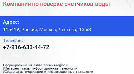 Компания по поверке счетчиков воды по адресу 115419, Россия, Москва, Лестева, 13 к3 в дальнейшем Организация, размещена в следующих категориях: