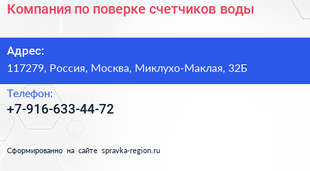 Компания по поверке счетчиков воды по адресу 117279, Россия, Москва, Миклухо-Маклая, 32Б в дальнейшем Организация, размещена в следующих категориях:
