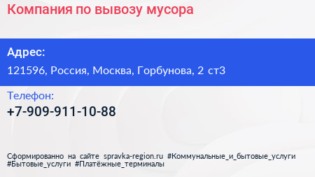 Компания по вывозу мусора по адресу 121596, Россия, Москва, Горбунова, 2 ст3 в дальнейшем Организация, размещена в следующих категориях: