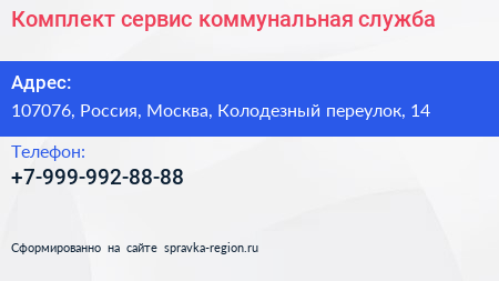 Комплект сервис, коммунальная служба по адресу 107076, Россия, Москва, Колодезный переулок, 14 в дальнейшем Организация, размещена в следующих категориях: