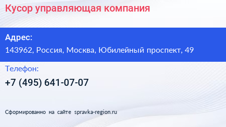 Кусор, управляющая компания по адресу 143962, Россия, Москва, Юбилейный проспект, 49 в дальнейшем Организация, размещена в следующих категориях: