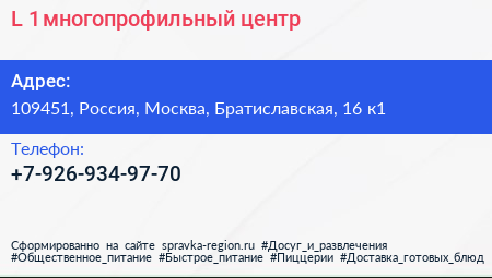 L 1, многопрофильный центр по адресу 109451, Россия, Москва, Братиславская, 16 к1 в дальнейшем Организация, размещена в следующих категориях: