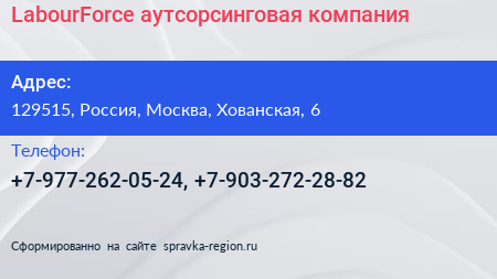 LabourForce, аутсорсинговая компания по адресу 129515, Россия, Москва, Хованская, 6 в дальнейшем Организация, размещена в следующих категориях:
