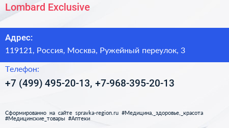 Lombard Exclusive по адресу 119121, Россия, Москва, Ружейный переулок, 3 в дальнейшем Организация, размещена в следующих категориях: