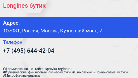 Longines, бутик по адресу 107031, Россия, Москва, Кузнецкий мост, 7 в дальнейшем Организация, размещена в следующих категориях: