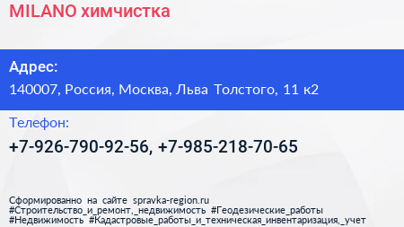 MILANO, химчистка по адресу 140007, Россия, Москва, Льва Толстого, 11 к2 в дальнейшем Организация, размещена в следующих категориях: