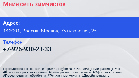 Майя, сеть химчисток по адресу 143001, Россия, Москва, Кутузовская, 25 в дальнейшем Организация, размещена в следующих категориях: