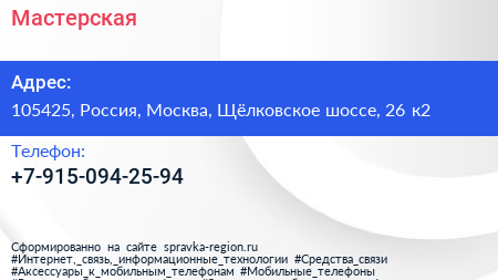 Мастерская по адресу 105425, Россия, Москва, Щёлковское шоссе, 26 к2 в дальнейшем Организация, размещена в следующих категориях: