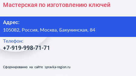 Мастерская по изготовлению ключей по адресу 105082, Россия, Москва, Бакунинская, 84 в дальнейшем Организация, размещена в следующих категориях: