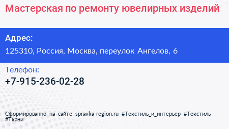 Мастерская по ремонту ювелирных изделий по адресу 125310, Россия, Москва, переулок Ангелов, 6 в дальнейшем Организация, размещена в следующих категориях: