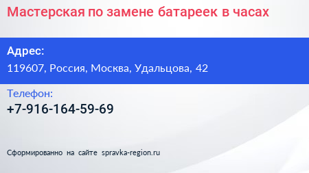 Мастерская по замене батареек в часах по адресу 119607, Россия, Москва, Удальцова, 42 в дальнейшем Организация, размещена в следующих категориях: