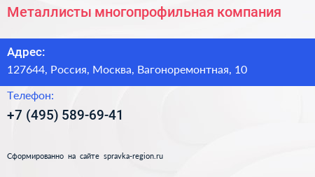 Металлисты, многопрофильная компания по адресу 127644, Россия, Москва, Вагоноремонтная, 10 в дальнейшем Организация, размещена в следующих категориях: