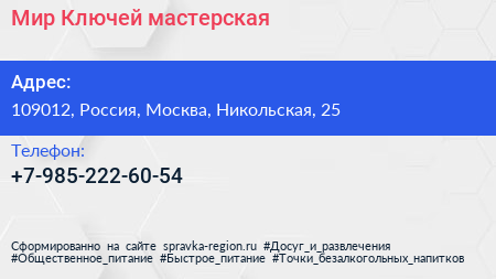 Мир Ключей, мастерская по адресу 109012, Россия, Москва, Никольская, 25 в дальнейшем Организация, размещена в следующих категориях: