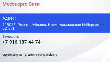 Мосэнерго Сити по адресу 115035, Россия, Москва, Космодамианская Набережная, 52 ст1 в дальнейшем Организация, размещена в следующих категориях: