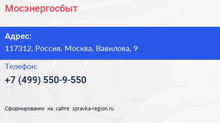 Мосэнергосбыт по адресу 117312, Россия, Москва, Вавилова, 9 в дальнейшем Организация, размещена в следующих категориях: