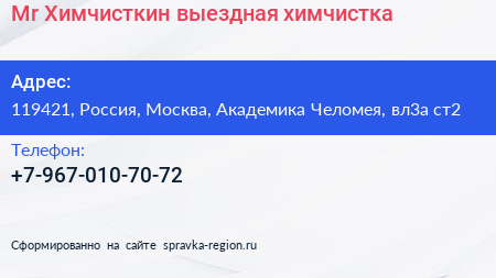 Mr.Химчисткин, выездная химчистка по адресу 119421, Россия, Москва, Академика Челомея, вл3а ст2 в дальнейшем Организация, размещена в следующих категориях: