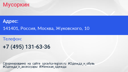 Мусоркин по адресу 141401, Россия, Москва, Жуковского, 10 в дальнейшем Организация, размещена в следующих категориях: