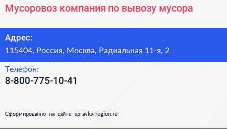Мусоровоз, компания по вывозу мусора по адресу 115404, Россия, Москва, Радиальная 11-я, 2 в дальнейшем Организация, размещена в следующих категориях: