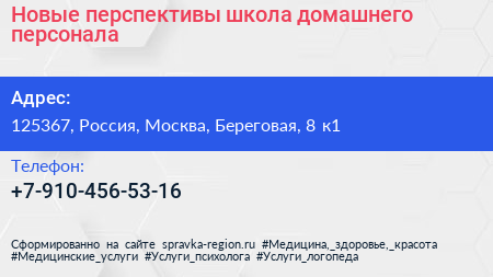 Новые перспективы, школа домашнего персонала по адресу 125367, Россия, Москва, Береговая, 8 к1 в дальнейшем Организация, размещена в следующих категориях: