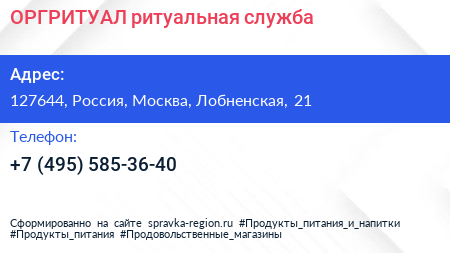 ОРГРИТУАЛ, ритуальная служба по адресу 127644, Россия, Москва, Лобненская, 21 в дальнейшем Организация, размещена в следующих категориях: