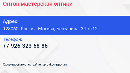 Оптон, мастерская оптики по адресу 123060, Россия, Москва, Берзарина, 34 ст12 в дальнейшем Организация, размещена в следующих категориях: