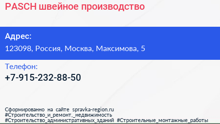 PASCH, швейное производство по адресу 123098, Россия, Москва, Максимова, 5 в дальнейшем Организация, размещена в следующих категориях: