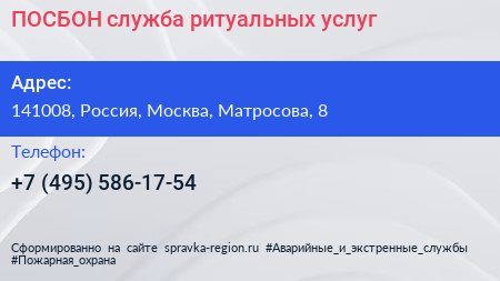 ПОСБОН, служба ритуальных услуг по адресу 141008, Россия, Москва, Матросова, 8 в дальнейшем Организация, размещена в следующих категориях: