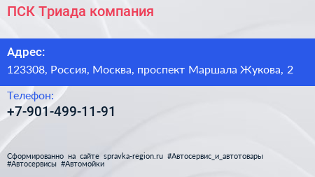 ПСК Триада, компания по адресу 123308, Россия, Москва, проспект Маршала Жукова, 2 в дальнейшем Организация, размещена в следующих категориях: