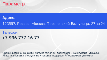 Параметр по адресу 123557, Россия, Москва, Пресненский Вал улица, 27 ст24 в дальнейшем Организация, размещена в следующих категориях: