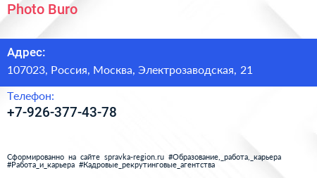 Photo Buro по адресу 107023, Россия, Москва, Электрозаводская, 21 в дальнейшем Организация, размещена в следующих категориях: