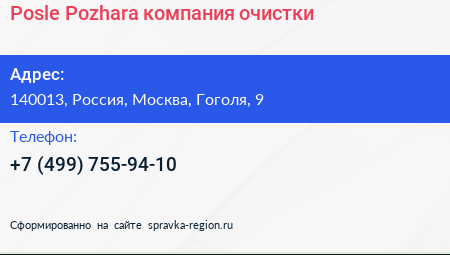 Posle Pozhara, компания очистки по адресу 140013, Россия, Москва, Гоголя, 9 в дальнейшем Организация, размещена в следующих категориях: