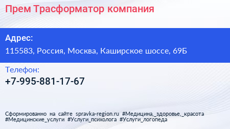 Прем Трасформатор, компания по адресу 115583, Россия, Москва, Каширское шоссе, 69Б в дальнейшем Организация, размещена в следующих категориях: