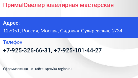 ПримаЮвелир, ювелирная мастерская по адресу 127051, Россия, Москва, Садовая-Сухаревская, 2/34 в дальнейшем Организация, размещена в следующих категориях: