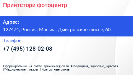 Принтстори, фотоцентр по адресу 127474, Россия, Москва, Дмитровское шоссе, 60 в дальнейшем Организация, размещена в следующих категориях: