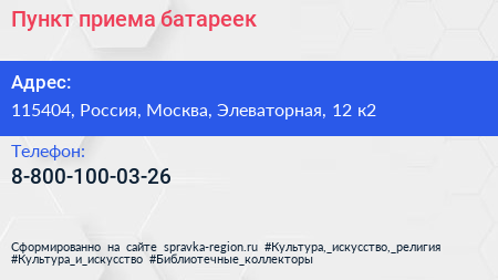 Пункт приема батареек по адресу 115404, Россия, Москва, Элеваторная, 12 к2 в дальнейшем Организация, размещена в следующих категориях: