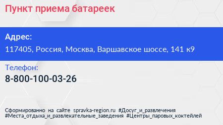 Пункт приема батареек по адресу 117405, Россия, Москва, Варшавское шоссе, 141 к9 в дальнейшем Организация, размещена в следующих категориях: