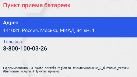 Пункт приема батареек по адресу 141031, Россия, Москва, МКАД 84 км, 1 в дальнейшем Организация, размещена в следующих категориях:
