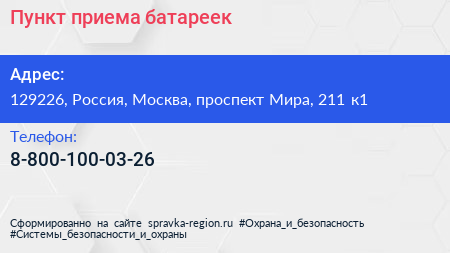 Пункт приема батареек по адресу 129226, Россия, Москва, проспект Мира, 211 к1 в дальнейшем Организация, размещена в следующих категориях: