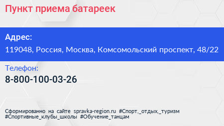 Пункт приема батареек по адресу 119048, Россия, Москва, Комсомольский проспект, 48/22 в дальнейшем Организация, размещена в следующих категориях: