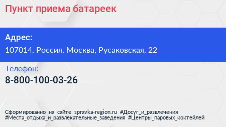 Пункт приема батареек по адресу 107014, Россия, Москва, Русаковская, 22 в дальнейшем Организация, размещена в следующих категориях: