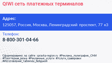 QIWI, сеть платежных терминалов по адресу 125057, Россия, Москва, Ленинградский проспект, 77 к3 в дальнейшем Организация, размещена в следующих категориях: