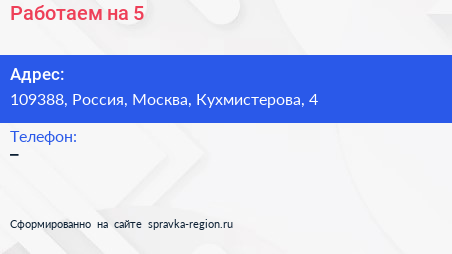 Работаем на 5 по адресу 109388, Россия, Москва, Кухмистерова, 4 в дальнейшем Организация, размещена в следующих категориях: