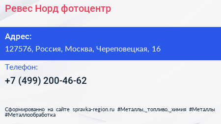 Ревес Норд, фотоцентр по адресу 127576, Россия, Москва, Череповецкая, 16 в дальнейшем Организация, размещена в следующих категориях: