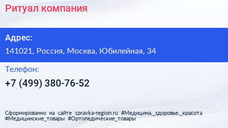 Ритуал, компания по адресу 141021, Россия, Москва, Юбилейная, 34 в дальнейшем Организация, размещена в следующих категориях: