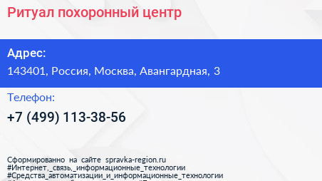 Ритуал, похоронный центр по адресу 143401, Россия, Москва, Авангардная, 3 в дальнейшем Организация, размещена в следующих категориях: