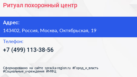 Ритуал, похоронный центр по адресу 143402, Россия, Москва, Октябрьская, 19 в дальнейшем Организация, размещена в следующих категориях: