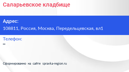 Саларьевское кладбище по адресу 108811, Россия, Москва, Передельцевская, вл1 в дальнейшем Организация, размещена в следующих категориях:
